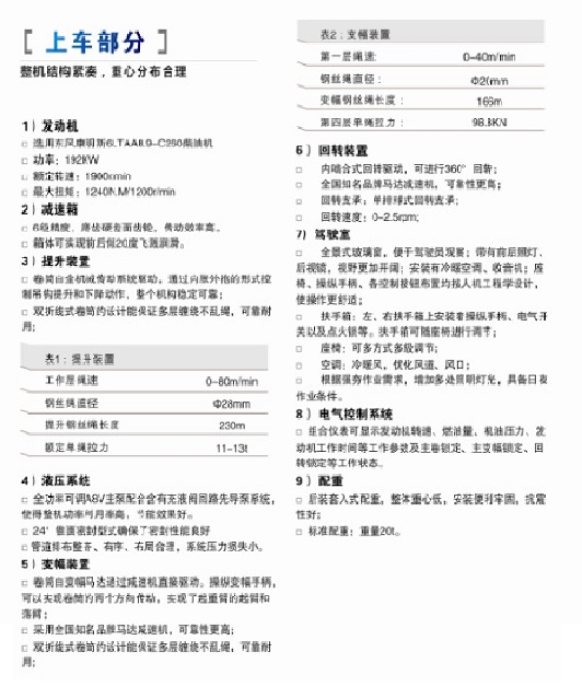 提高結(jié)構(gòu)件強度、加快傳動部件效率、高效節(jié)能液壓系統(tǒng)可靠性高。 主卷揚提升機構(gòu)采用機械傳動,行走、回轉(zhuǎn)、變幅及履帶伸縮采用液壓傳動。