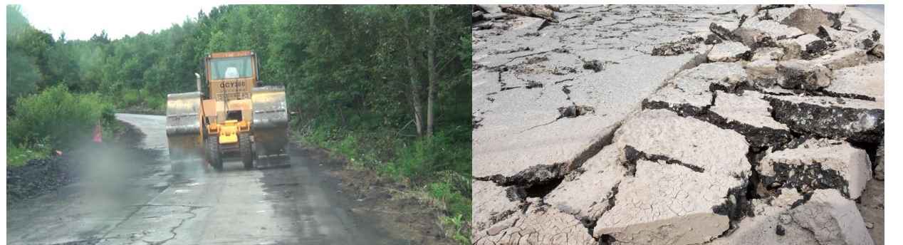 (1)打裂壓穩(wěn)。打裂壓穩(wěn)通常用于消除瀝青面層的反射裂縫。處理后的板塊長度應(yīng)在30—100mm,打裂后,通過壓實有效地消除板下脫空,恢復(fù)基層對水泥混凝土板塊的支撐作用。打裂壓穩(wěn)技術(shù)成功地用于改造結(jié)構(gòu)完好、僅存在功能性破壞的普通水泥混凝土路面。使用打裂壓穩(wěn)時須考慮到板塊整體性的損失。沖擊壓實設(shè)備對水泥混凝土路面的破碎就屬于典型的打裂壓穩(wěn)。