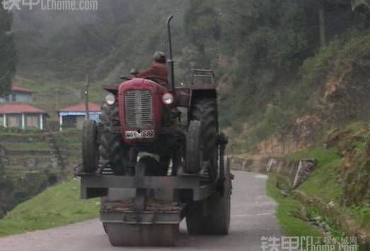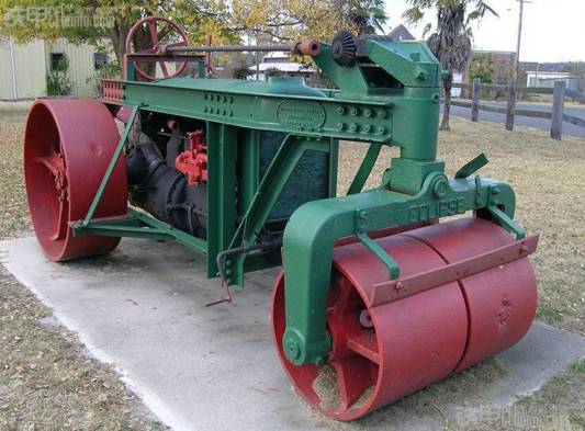 柴油動力壓路機(jī)向近現(xiàn)代壓路機(jī)發(fā)展的路上,出現(xiàn)了很多大膽創(chuàng)意的壓路機(jī)。下圖便是一臺通過安裝在滾壓鋼輪上方的拖拉機(jī)來提供動力的奇特壓路機(jī)。