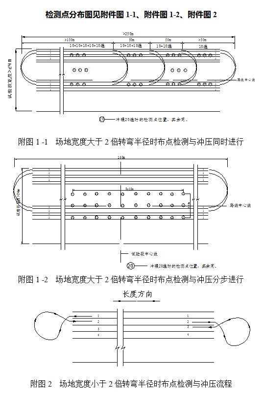 2.3 施工場地寬度大于沖擊壓路機轉彎直徑的兩倍時,以道路中心線對稱地將場地分成兩半,壓實道線如附圖1;施工場地的寬度小于兩倍轉彎直徑,可按附圖2的碾壓方式進行,并根據實際情況在施工場地的兩端設置所需的轉彎場地。