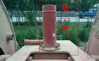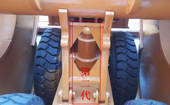 第一代舉升油缸(見左圖),硬性固定在機架上部,用于短途轉場時撐起沖擊碾壓輪,活塞桿頂端頂頭處與機架完全分離。