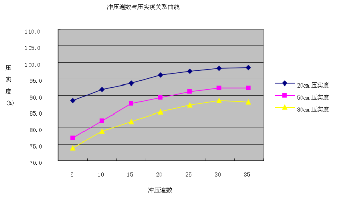 雖然沖擊壓實(shí)技術(shù)已在全國(guó)廣泛采用,但由于土質(zhì)、沖壓壓路機(jī)型號(hào),應(yīng)用條件等各不相同,其壓實(shí)效果、施工工藝、質(zhì)量控制亦不相同,因此需要在施工前修筑試驗(yàn)路段,以確定合適的施工工藝,質(zhì)量控制標(biāo)準(zhǔn)。