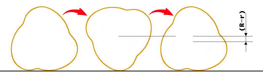 沖擊壓路機自身沒有動力,是通過前面的牽引裝置進行牽引,從而來進行工作。沖擊式壓路機沖擊碾壓輪滾動時,其質心上下擺動,完成蓄能、釋放、沖擊 3 個過程,以產生的勢能和動能聯(lián)合作用于地面。利用多邊形滾輪的大小半徑產生位能落差與行駛的動能相結合沿地面對土石材料進行靜壓、搓揉、沖擊的連續(xù)沖擊碾壓作業(yè),形成高振幅、低頻率的沖擊壓實原理。所以沖擊壓路機碾壓輪滾動的同時,對牽引裝置有一定的速度要求。