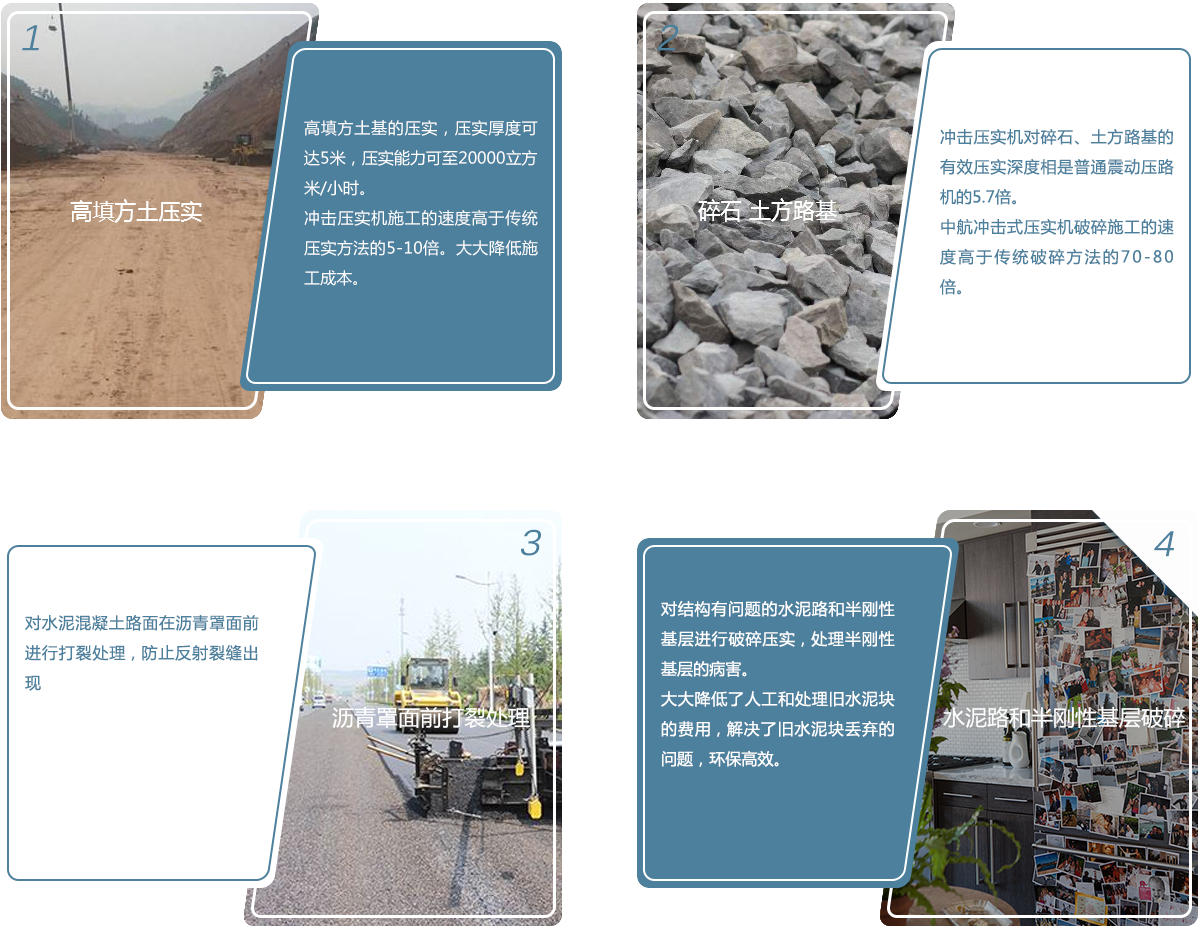 3、沖擊壓實機對碎石、土方路基的有效壓實深度相是普通震動壓路機的5.7倍。